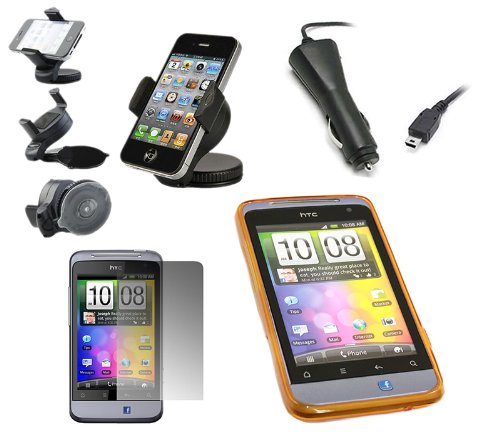 iTALKonline CAR DRIVE Pack ARANCIONE Custodia morbida PROGEL Hydro / Cover / Skin, Schermo LCD / Scratch Protector, 12/24V Caricabatteria da auto, supporto da auto per parabrezza di aspirazione per HTC Salsa Andriod (FaceBook) SmartPhone
