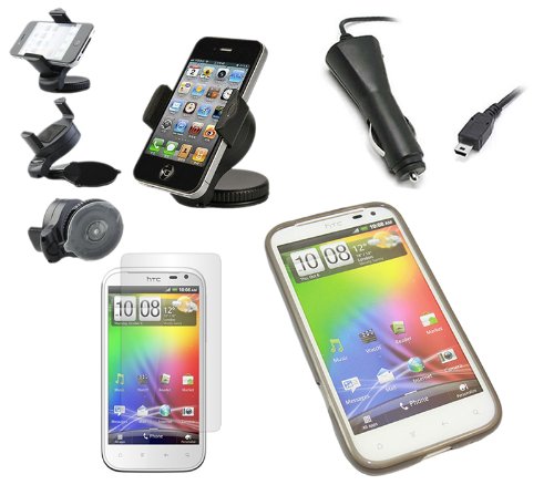iTALKonline CAR DRIVE Pack NERO Custodia morbida PROGEL Hydro / Cover / Skin, Schermo LCD / Scratch Protector, 12/24V Caricabatteria da auto, supporto da auto per parabrezza di aspirazione per HTC Sensation XL Andriod SmartPhone
