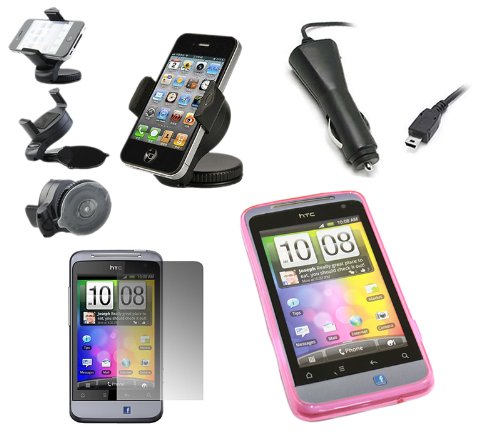 iTALKonline CAR DRIVE Pack ROSA Custodia morbida PROGEL Hydro / Cover / Skin, Schermo LCD / Scratch Protector, 12/24V Caricabatteria da auto, supporto da auto per parabrezza di aspirazione per HTC Salsa Andriod (FaceBook) SmartPhone