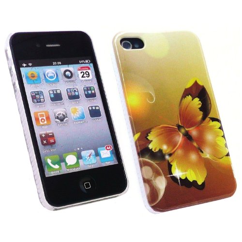 Kit Me Out IT - Apple iPhone 4 / 4G / HD - Pacco Di Economia - LCD Pellicola Protettiva Schermo + Caricabatteria Da Auto Compatibile Apple + Protezione Custodia / Cover / Skin Super Slim - Giallo Farfalle