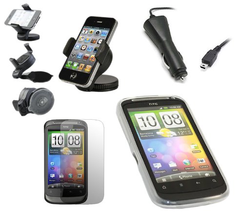iTALKonline CAR DRIVE Pack BIANCO Custodia morbida PROGEL Hydro / Cover / Skin, Schermo LCD / Scratch Protector, 12/24V Caricabatteria da auto, supporto da auto per parabrezza di aspirazione per HTC Desire S DesireS Andriod SmartPhone