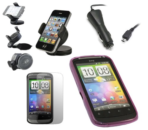 iTALKonline CAR DRIVE Pack PORPORA Custodia morbida PROGEL Hydro / Cover / Skin, Schermo LCD / Scratch Protector, 12/24V Caricabatteria da auto, supporto da auto per parabrezza di aspirazione per HTC Desire S DesireS Andriod SmartPhone