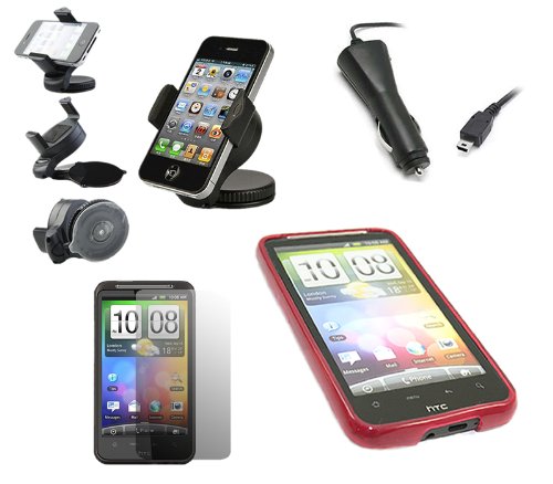 iTALKonline CAR DRIVE Pack ROSSO Custodia morbida PROGEL Hydro / Cover / Skin, Schermo LCD / Scratch Protector, 12/24V Caricabatteria da auto, supporto da auto per parabrezza di aspirazione per HTC Desire HD Andriod SmartPhone