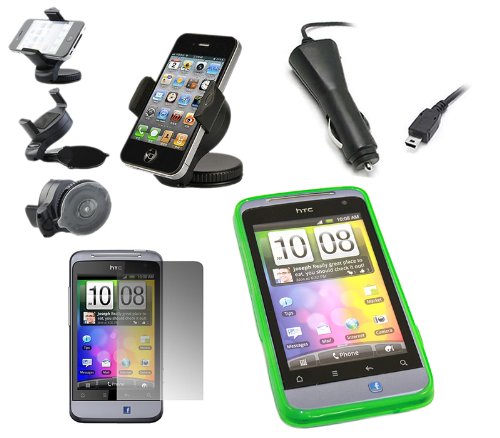 iTALKonline CAR DRIVE Pack VERDE Custodia morbida PROGEL Hydro / Cover / Skin, Schermo LCD / Scratch Protector, 12/24V Caricabatteria da auto, supporto da auto per parabrezza di aspirazione per HTC Salsa Andriod (FaceBook) SmartPhone
