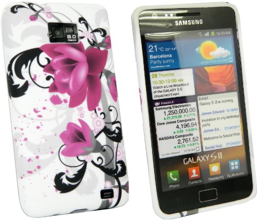 Kit Me Out IT - Samsung Galaxy S2 II i9100 Android Pacco Di Economia - Protezione Custodia / Cover / Skin Gel TPU Porpora Fiori + LCD Pellicola Protettiva Schermo + Compatibile Micro USB Nel Caricatore Dell'Automobile