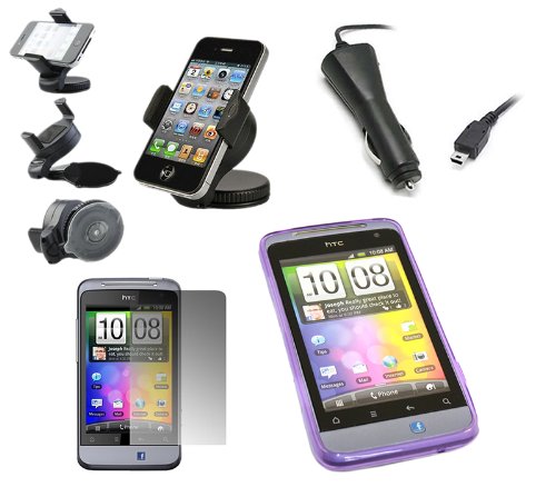 iTALKonline CAR DRIVE Pack PORPORA Custodia morbida PROGEL Hydro / Cover / Skin, Schermo LCD / Scratch Protector, 12/24V Caricabatteria da auto, supporto da auto per parabrezza di aspirazione per HTC Salsa Andriod (FaceBook) SmartPhone