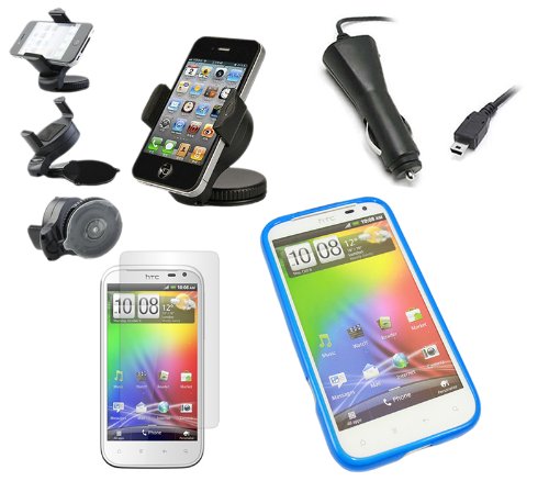 iTALKonline CAR DRIVE Pack BLU Custodia morbida PROGEL Hydro / Cover / Skin, Schermo LCD / Scratch Protector, 12/24V Caricabatteria da auto, supporto da auto per parabrezza di aspirazione per HTC Sensation XL Andriod SmartPhone
