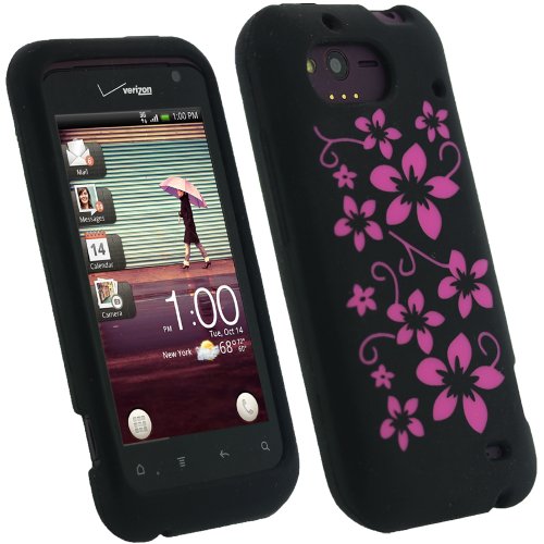 igadgitz Nero & Rosa Floreale Custodia Silicone Skin Case Cover Protezione per HTC Rhyme Android Smartphone + Protettore Schermo