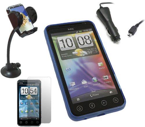 iTALKonline CAR DRIVE Pack BLU Custodia morbida PROGEL Hydro / Cover / Skin, Schermo LCD / Scratch Protector, 12/24V Caricabatteria da auto, supporto da auto per parabrezza di aspirazione per HTC Evo 3D Andriod SmartPhone