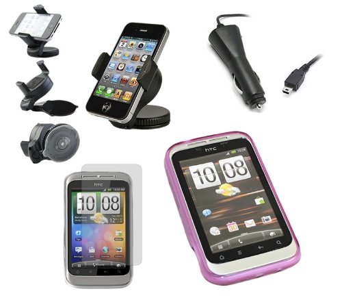 iTALKonline CAR DRIVE Pack PORPORA Custodia morbida PROGEL Hydro / Cover / Skin, Schermo LCD / Scratch Protector, 12/24V Caricabatteria da auto, supporto da auto per parabrezza di aspirazione per HTC WildFire S WildFireS Andriod SmartPhone